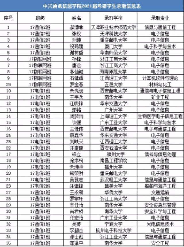 据统计,中兴公司有67名同学投身考研,上线人数41人,上线率达61%,录取人数36人,录取率达54%。其中多数同学被厦门大学、华南师范大学、福州大学、西安邮电大学、广东工业大学等985、211、双一流等知名高校录取。并再次出现5人全部成功考研的“学霸”宿舍。另外,17级电子信息工程2班朱坤华同学以411分的高分被福州大学录取。