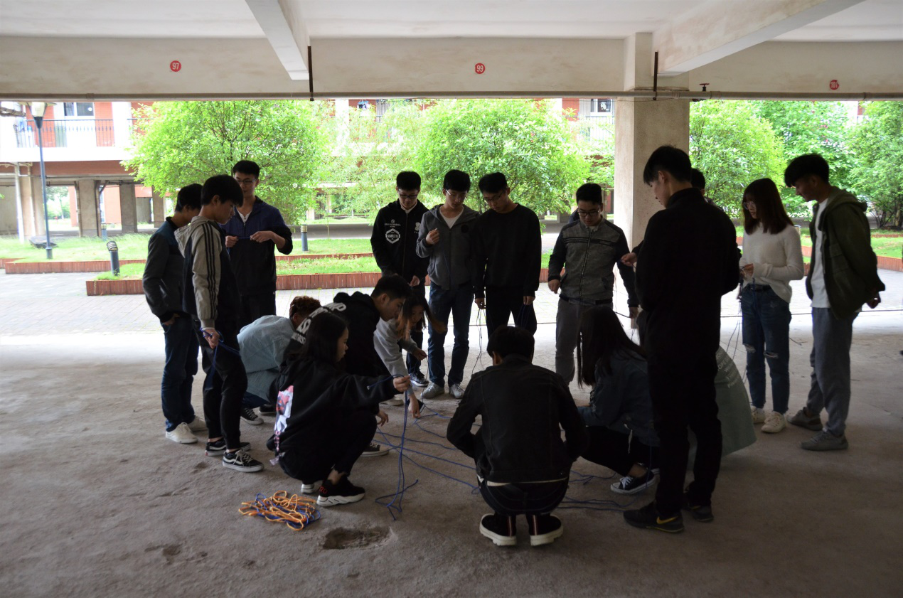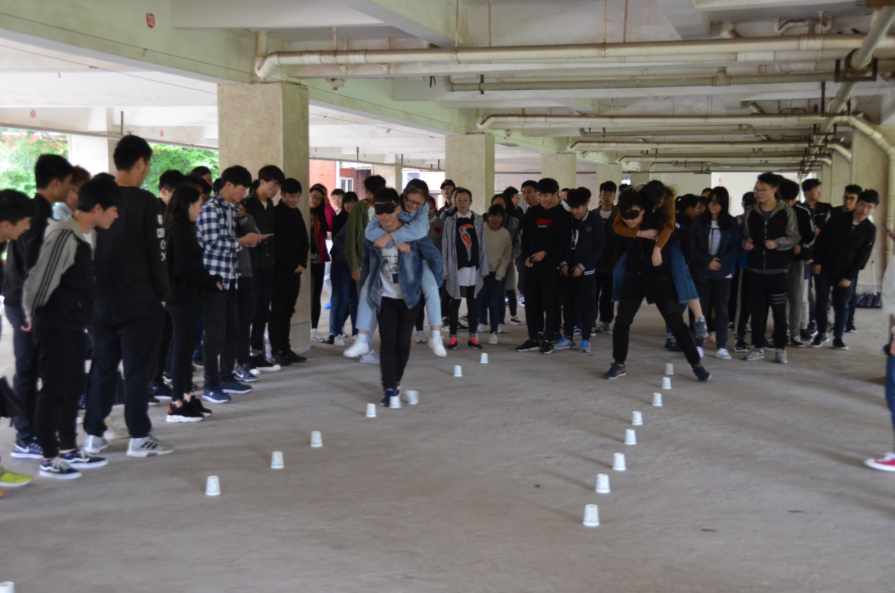 活动当天飘着蒙蒙的细雨,但这样的天气并未影响大家的心情。活动开始第一项 “仙人指路”便是一个难度颇高的双人配合游戏,一个人蒙住双眼背另一人前行,背上的人负责指挥通过障碍。有的组合稳步前进有的组合却摇摇晃晃,让大家看到相互配合的重要性。第二个项目“织网颠球”则是在于考验大家的团结协作能力,每个班的同学要运用集体力量和智慧用有限的30条绳子在有限的时间内编织一张网颠起篮球并且不漏下。大家团结协作,一起集中智慧完成了这个任务。第三个项目便是难度最高的“衔纸杯传水”每一支队伍的队员用嘴咬住纸杯传递杯中的水,虽然在游戏的过程中大家窘态百出,但是还是体验到了团队合作的乐趣。最终骨干三班取得本次活动的第一名,学员们依次挑选了自己心仪的奖品。