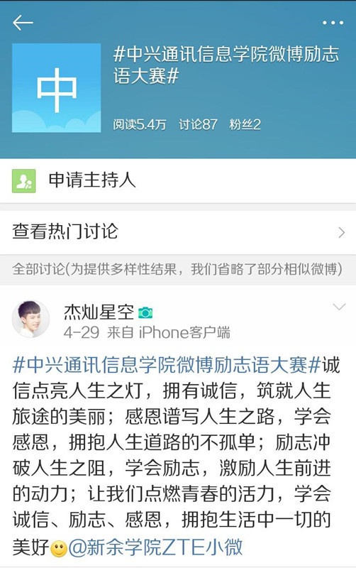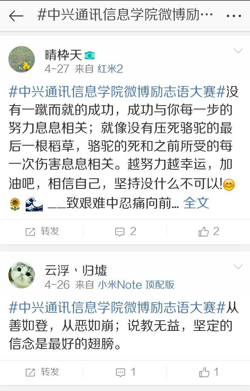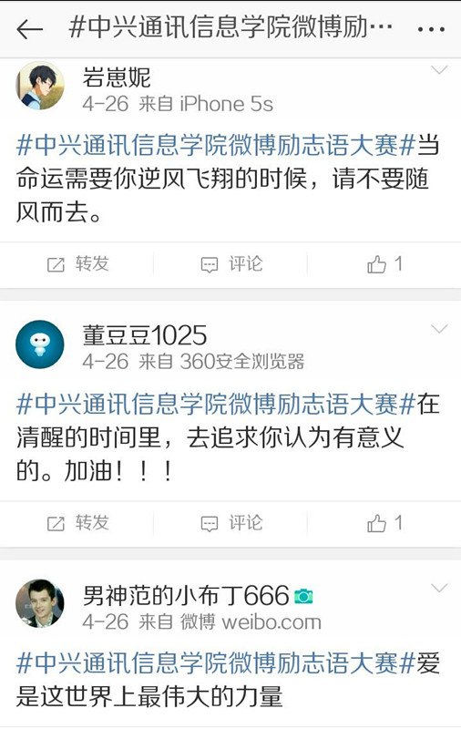 为了传递社会正能量,促使同学们健康成长;公司于4月26日在公司的官方微博平台上开展了微博励志语征集大赛。本次比赛面向公司15级全体员工,大赛共收到150余条微博励志语。